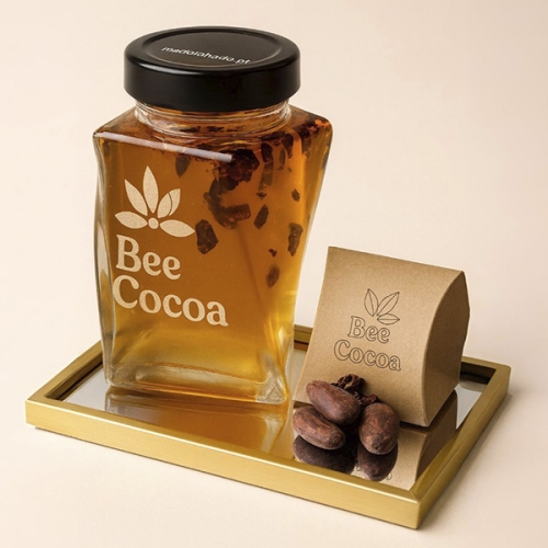 O frasco hexagonal reflete a geometria sagrada das abelhas, símbolo de harmonia e equilíbrio, enquanto a tampa em madeira acrescenta um toque natural e sofisticado. No seu interior esconde-se ainda um detalhe exclusivo: uma colher de mel integrada, que transforma cada degustação numa experiência prática, elegante e consciente.